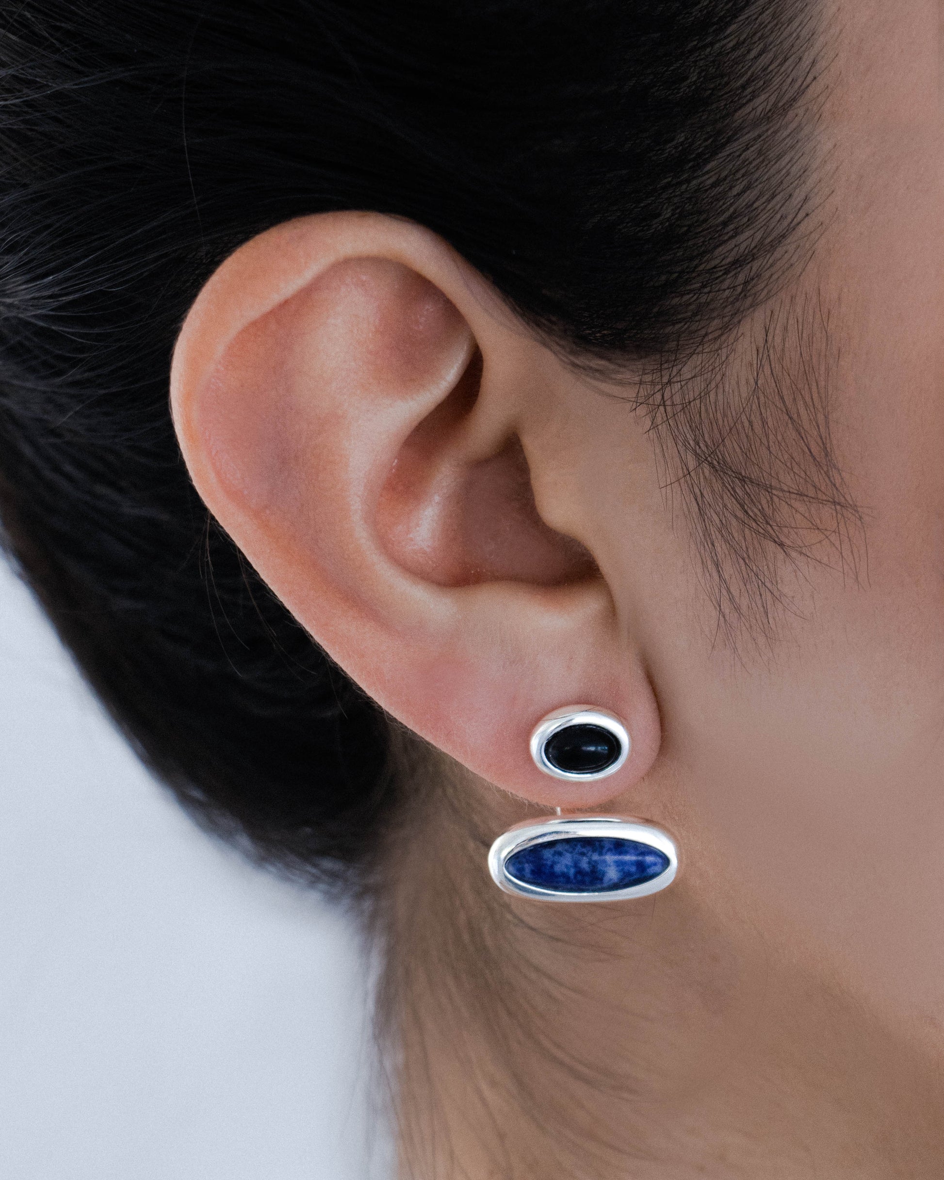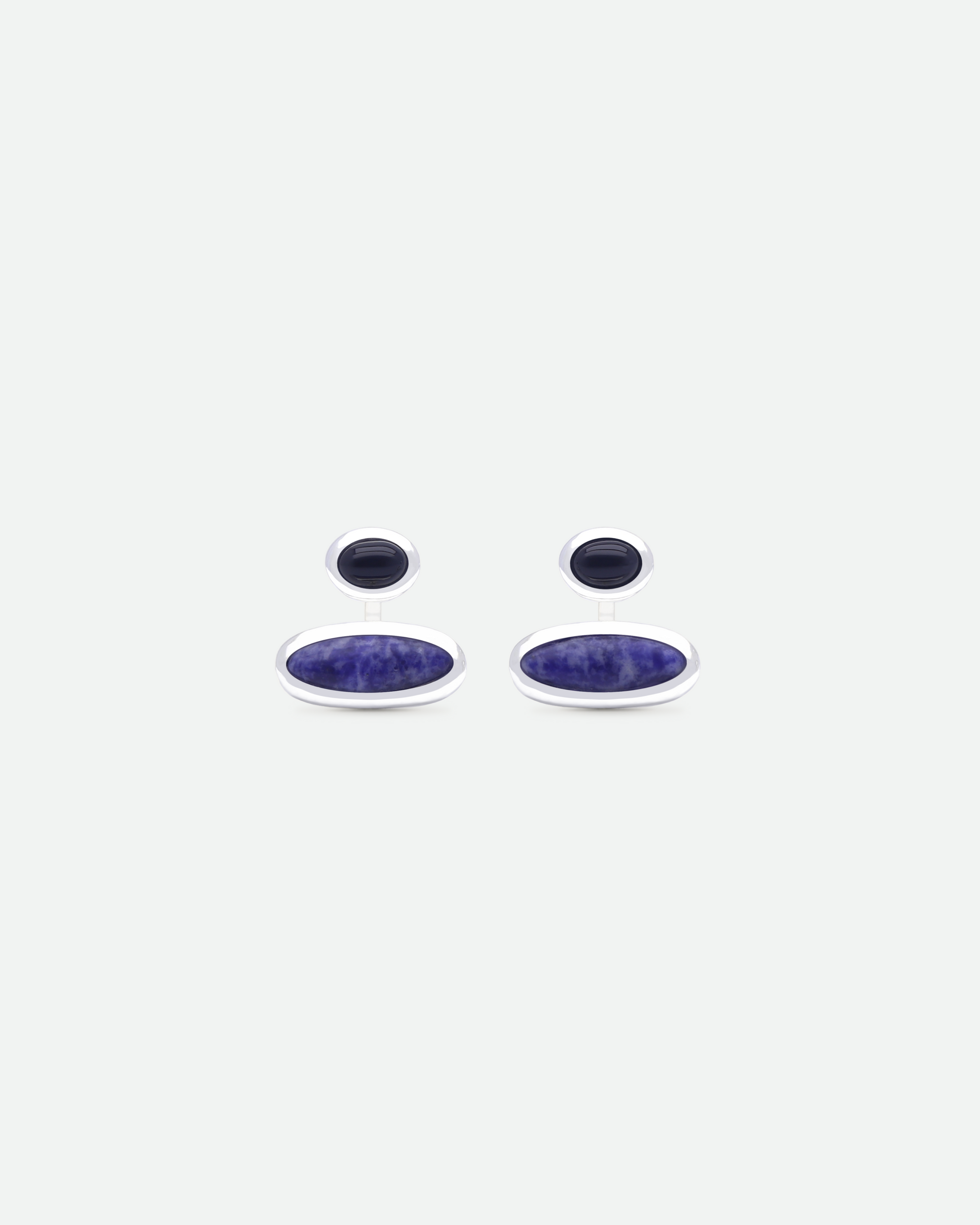 Hand polished sterling silver earrings with custom cut black onyx and sodalite.